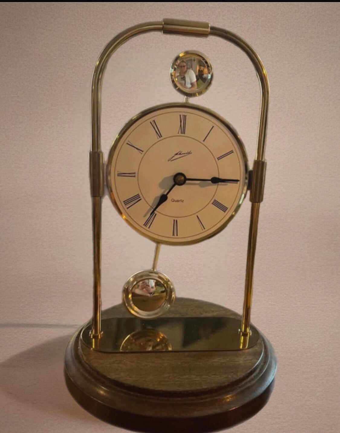 De elegante klok met een uurwerk van Quartz wordt geleverd met een glazen stolp. Aan de achterkant van de klok is het uurwerk volledig zichtbaar. De 2 gouden klepeltjes gaan van links naar rechts om het uurwerk te laten draaien.